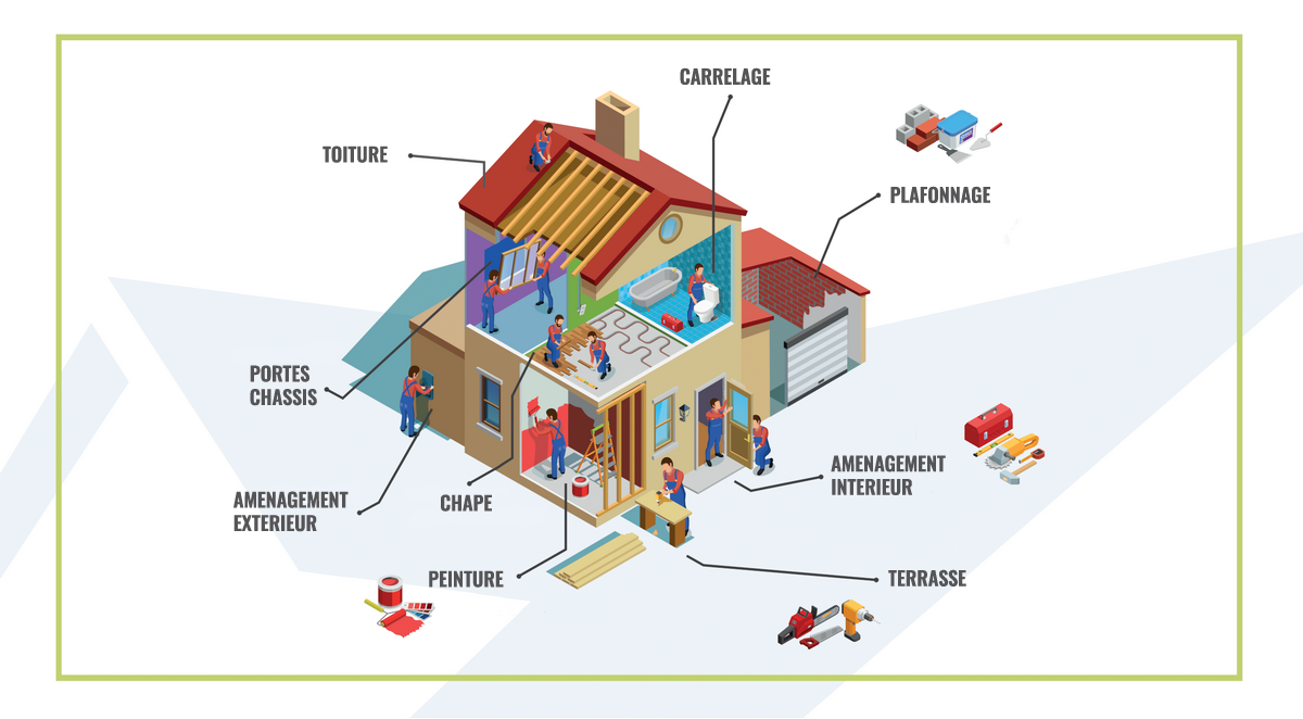 Rénovation de votre bâtiment, maison, appartement, … nos domaines d'activité sont vastes, comme par exemple, le plafonnage, la pose de chape, de carrelages sol et murs, de cloisons gyproc, isolation, peinture, travaux de toiture, pose de châssis/fenêtre, portes d’entrée, portes intérieures, fenêtres de toit, ...
